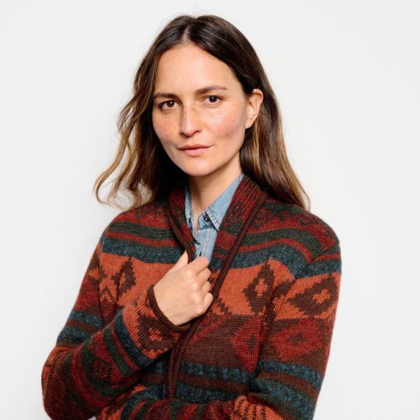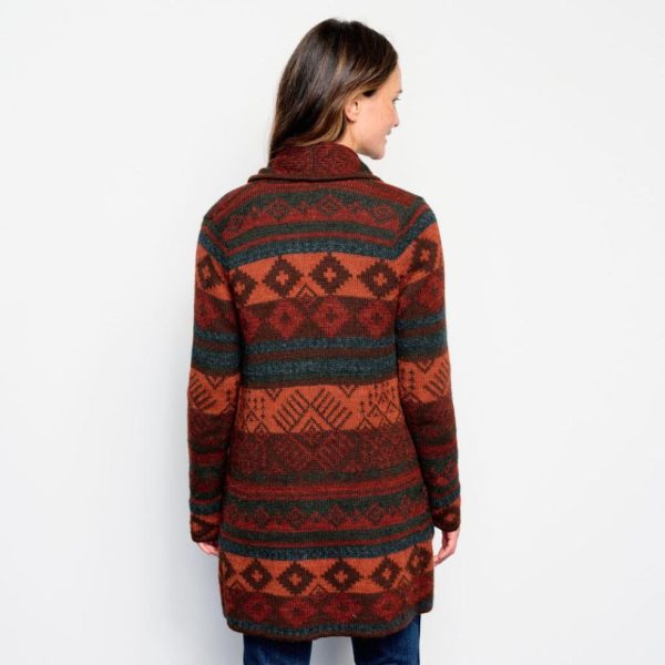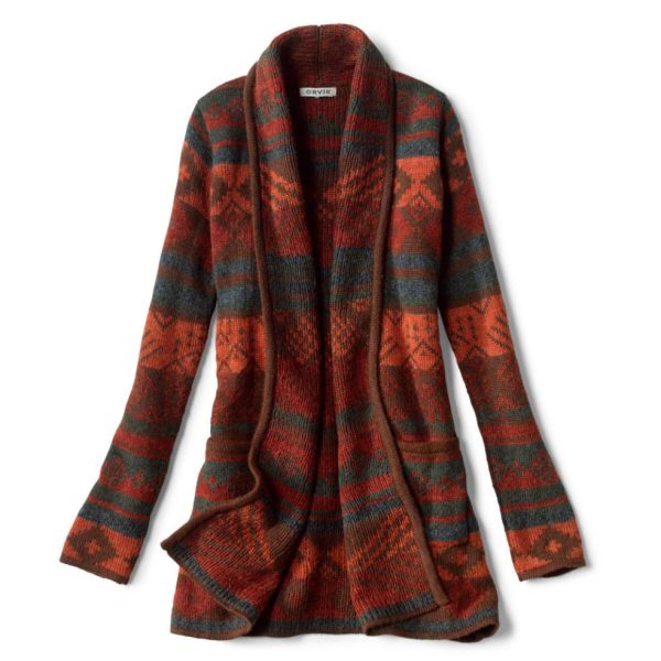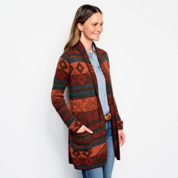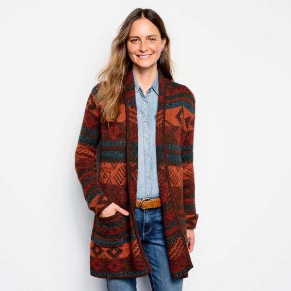 Here’s a reason to look forward to frosty days—the luxurious warmth and softness of our Alpaca Blanket Stripe Cardigan. The jacquard knit blends alpaca and cotton yarns to create an allover blanket pattern that lends any outfit a Western vibe. And the longer tunic length pairs perfectly with skinny jeans, slim pants, or leggings. Finished with two patch pockets. Classic Fit, universally flattering with moderate shaping. In adobe multi.