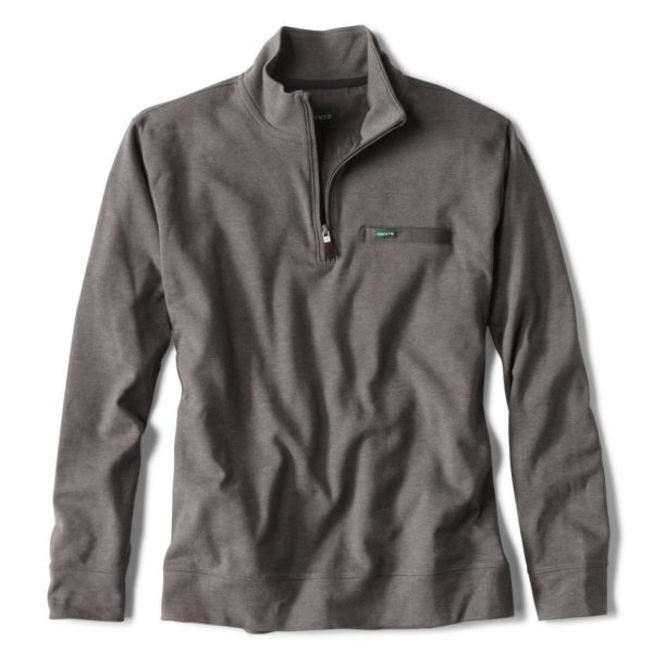 Extreme comfort is the hallmark of this ribbed quarter-zip pullover that provides lightweight warmth through every season. A double-faced, ribbed cotton blend, the fabric is heathered on the exterior and solid inside. Zipped chest pocket for secure carry of essentials. Herringbone tape at the back neck and zipper with suede pull at the center front. Classic fit.