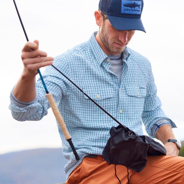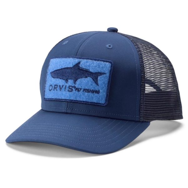 Always a great fit, our stretch twill trucker hat features a brim made with recycled fishing nets and a hook-and-loop front patch you can park your flies on. An embroidered tarpon (medium blue), permit (aqua), musky (olive), or trout (red/white/blue) on the front patch.