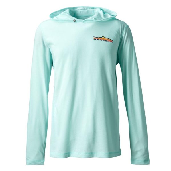 Stay cool and covered in this breezy drirelease hoodie with a colorful mountain sunrise logo on the back. Patented blend of polyester and cotton is naturally moisture wicking and quick drying with no chemical or topical treatments. Dries four times faster than cotton. Soft, natural feel with built-in odor protection.
