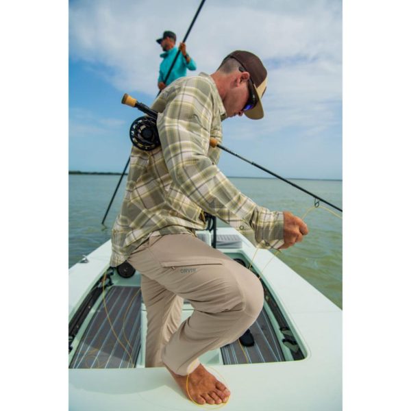Coated with Durable Water Repellent (DWR) for nearly instantaneous drying when jumping between the skiff and the water, the UPF 50+ lightweight material we use in the Men’s PRO Sun Skiff Pants is made from double weave 4-way stretch nylon—but it’s not the nylon you remember. Ours is soft, stretchy, and simply cannot hold water. This is versatile waist-to-foot sun coverage, tapered down low to eliminate annoying wind flap on breezy afternoons or when running boats. Less material and an adjustable hem in the lower leg also mean significantly reduced water drag and fatigue when wet wading. Dual hand pockets with a zippered leg pocket capable of housing a small to medium fly box. Zippered back pocket for security. Athletic Fit. In safari.