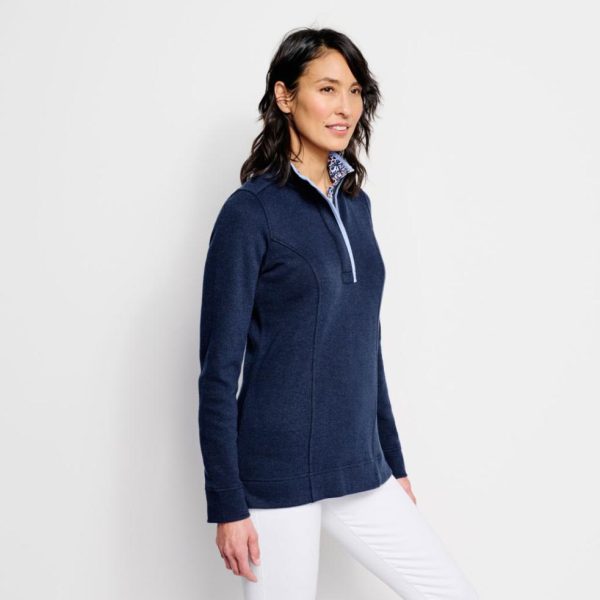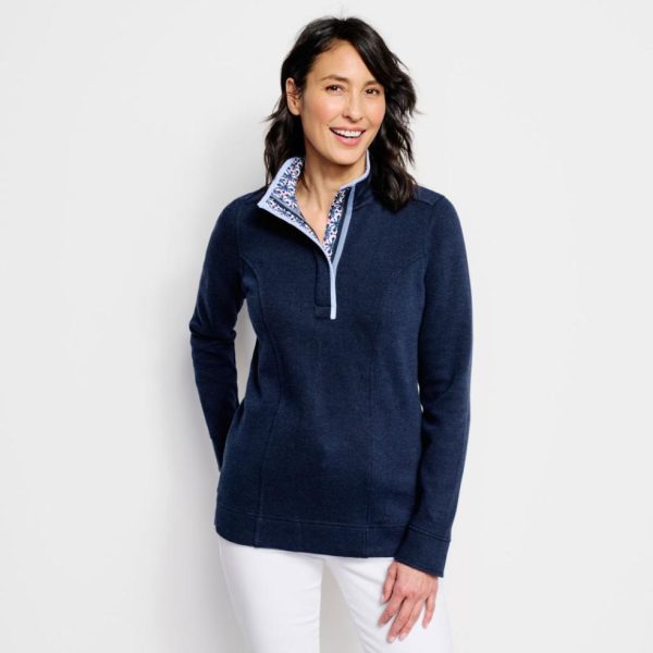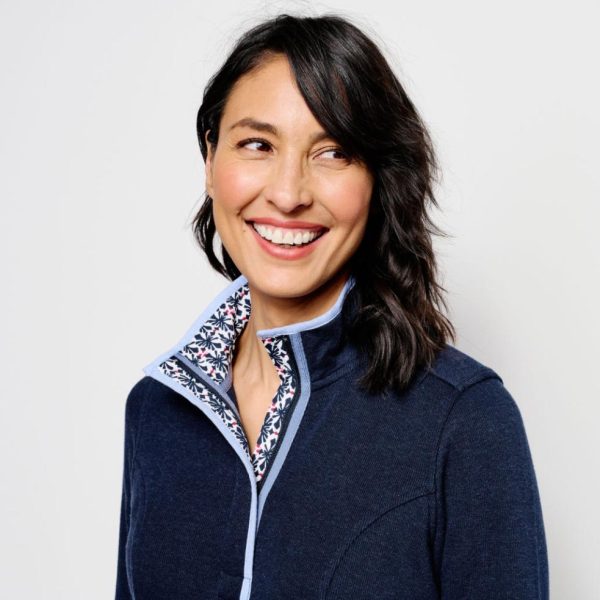 Washed and brushed for softness, this pure cotton French rib sweatshirt is the one you’ll want to live in 7 days a week. Twill taping lends a pop of color to the covered placket complementing the print trim and creating a slightly dressier looking sweatshirt. Chambray trim along the collar and placket present a clean finish when the neckline is zipped up. The complementing print trim is echoed on the interior cuff—turn it back if you enjoy the look. And the interior hemline is lined with chambray and the side slits with twill taping to ensure long-lasting style. Active Fit, shaped to contour your figure without restricting.