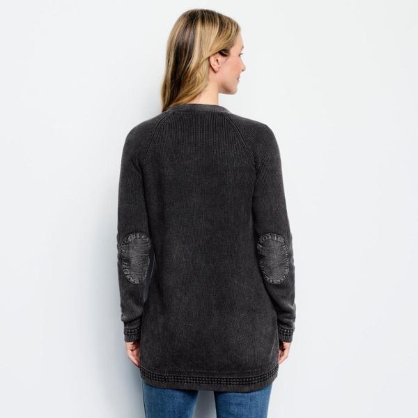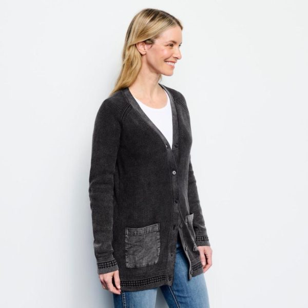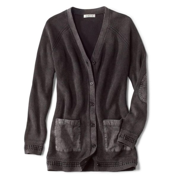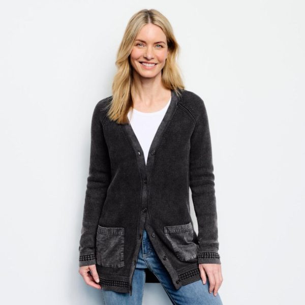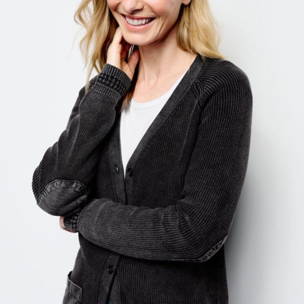 Trimmed with woven cotton elbow patches and patch pockets, the pure cotton Stitch Mixed Media Cardigan sweater is garment dyed to create the slightly distressed look and feel of that go-to piece you’ve loved for years. Intricate stitching along the hem and cuffs adds character to this unique button-front style, while its longer length pairs wonderfully with skinny jeans or leggings. Classic Fit, universally flattering with moderate shaping. In charcoal.
