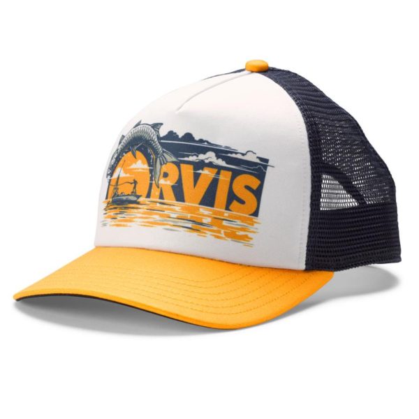 Our foam dome trucker hat is finished with a jumping tarpon to inspire your adventures on the water. Snap-back closure adjusts for a custom fit. In white.