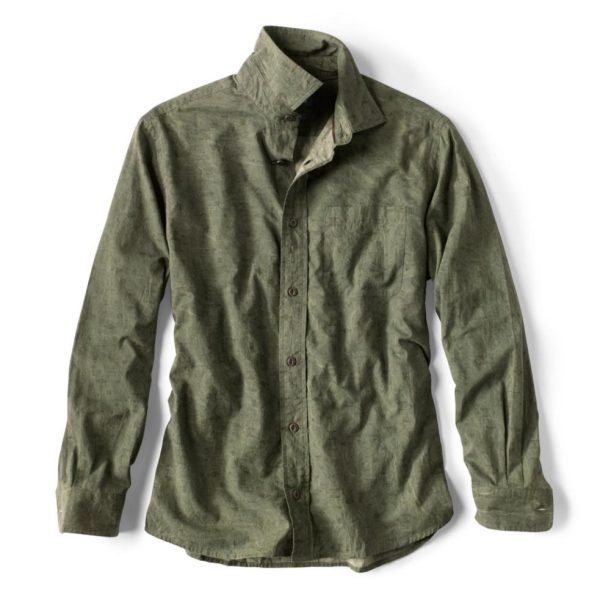 Pigment-washed for a broken-in look and feel from the start, this pure cotton shirt only gets better with wear. The allover geometric symbol print is an Orvis exclusive (we even snuck in a fish) and is inspired by the American West—layer it with your favorite chore coat for a road trip-ready combination that’ll inspire you to take the scenic route. Back side pleats allow for easy range of motion. Spread collar, one patch pocket, button-adjustable cuffs, and contrast grosgrain piping inside the neck. Classic fit. In juniper.